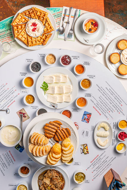 Pão Integral - Pão Branco - Pão de Mel - Geleias: 10 sabores - Temperos agridoces: 2 sabores - Queijo Fresco - Requeijão: 3 sabores Omelete - Pão de Queijo - Biscoito de Queijo - Broa de Milho - Salada de Frutas - Granola - Mel - Coalhada - Chanclish - Carne ( lagarto) - Manteiga - Waffle - Tortinha de Banana - Chantily - Café - Leite - Refresco de Erva Cidreira com limão, Sucos.e outras iguarias sazonais.